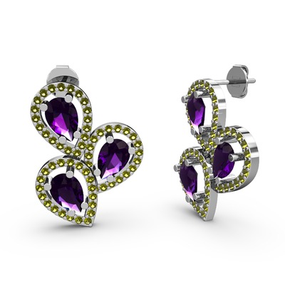 Peridot ve ametist 18 ayar beyaz altın küpe