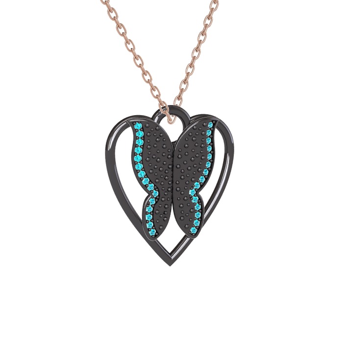 Akuamarin 925 ayar siyah rodyum kaplama gümüş kolye (40 cm rose altın rolo zincir)