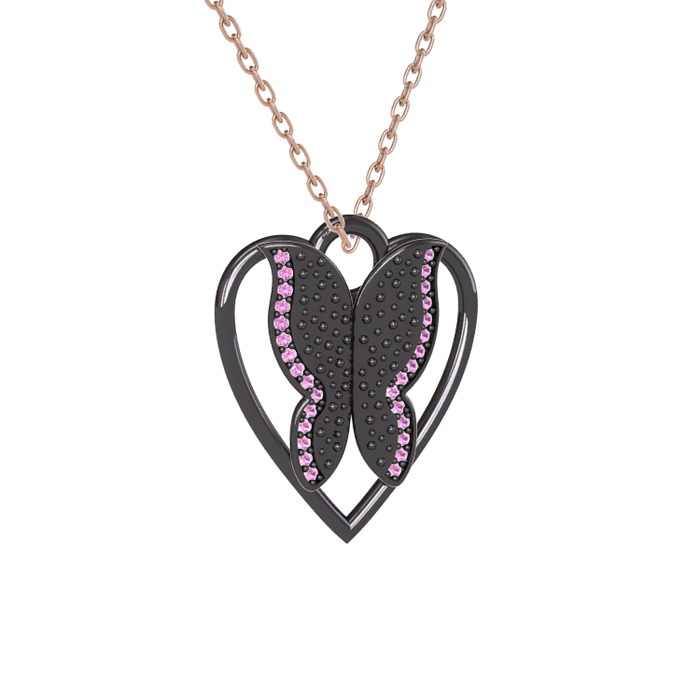 Pembe kuvars 925 ayar siyah rodyum kaplama gümüş kolye (40 cm rose altın rolo zincir)