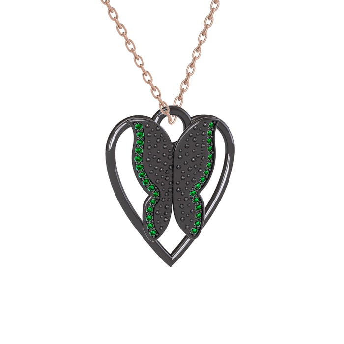 Yeşil kuvars 925 ayar siyah rodyum kaplama gümüş kolye (40 cm rose altın rolo zincir)