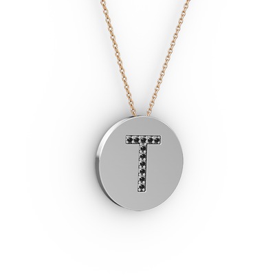T Baş Harf Kolye - Siyah zirkon 8 ayar beyaz altın kolye (40 cm gümüş rolo zincir)