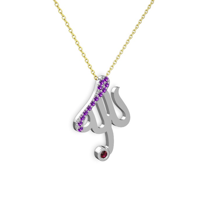 Ametist ve rodolit garnet 18 ayar beyaz altın kolye (40 cm altın rolo zincir)