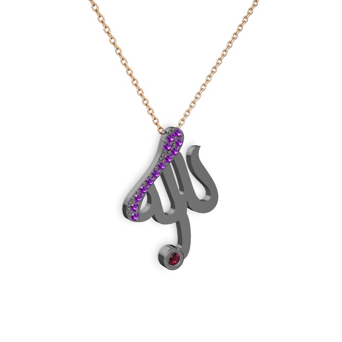 Ametist ve rodolit garnet 925 ayar siyah rodyum kaplama gümüş kolye (40 cm rose altın rolo zincir)