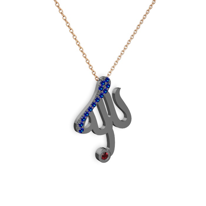 Lab safir ve garnet 925 ayar siyah rodyum kaplama gümüş kolye (40 cm rose altın rolo zincir)