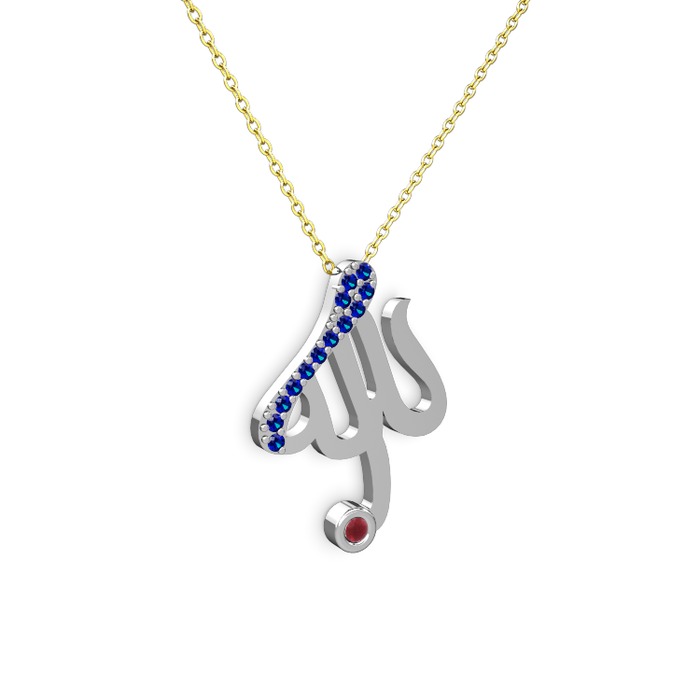 Lab safir ve kök yakut 925 ayar gümüş kolye (40 cm altın rolo zincir)