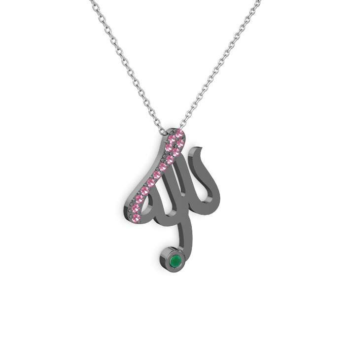 Pembe kuvars ve kök zümrüt 925 ayar siyah rodyum kaplama gümüş kolye (40 cm beyaz altın rolo zincir)