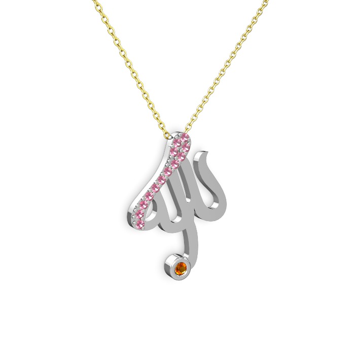 Pembe kuvars ve sitrin 8 ayar beyaz altın kolye (40 cm gümüş rolo zincir)