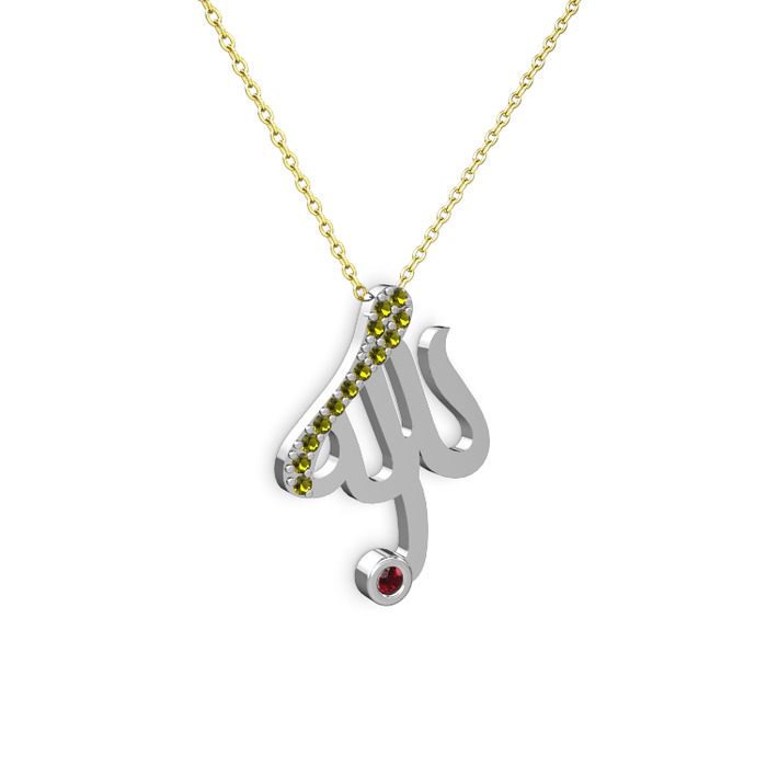 Peridot ve garnet 8 ayar beyaz altın kolye (40 cm gümüş rolo zincir)