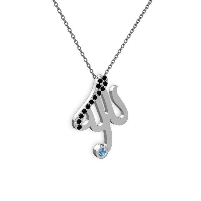 Siyah zirkon ve akuamarin 8 ayar beyaz altın kolye (40 cm gümüş rolo zincir)
