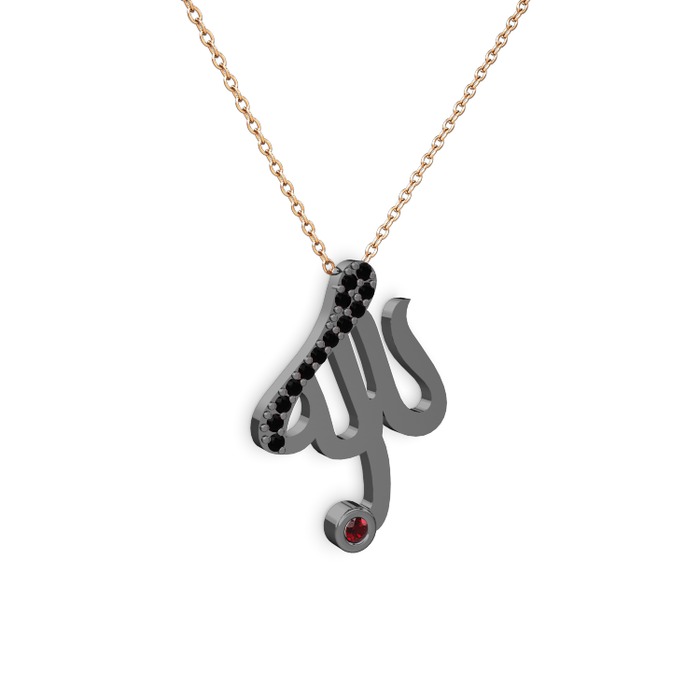 Siyah zirkon ve garnet 925 ayar siyah rodyum kaplama gümüş kolye (40 cm rose altın rolo zincir)