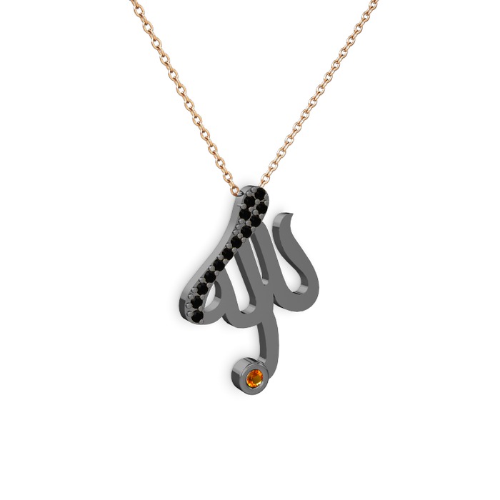 Siyah zirkon ve sitrin 925 ayar siyah rodyum kaplama gümüş kolye (40 cm rose altın rolo zincir)