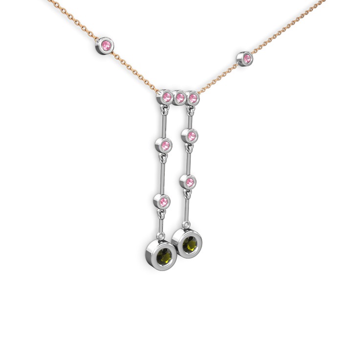 Peridot ve pembe kuvars 8 ayar beyaz altın kolye (40 cm rose altın rolo zincir)