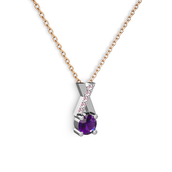 Ametist ve pembe kuvars 14 ayar beyaz altın kolye (40 cm rose altın rolo zincir)