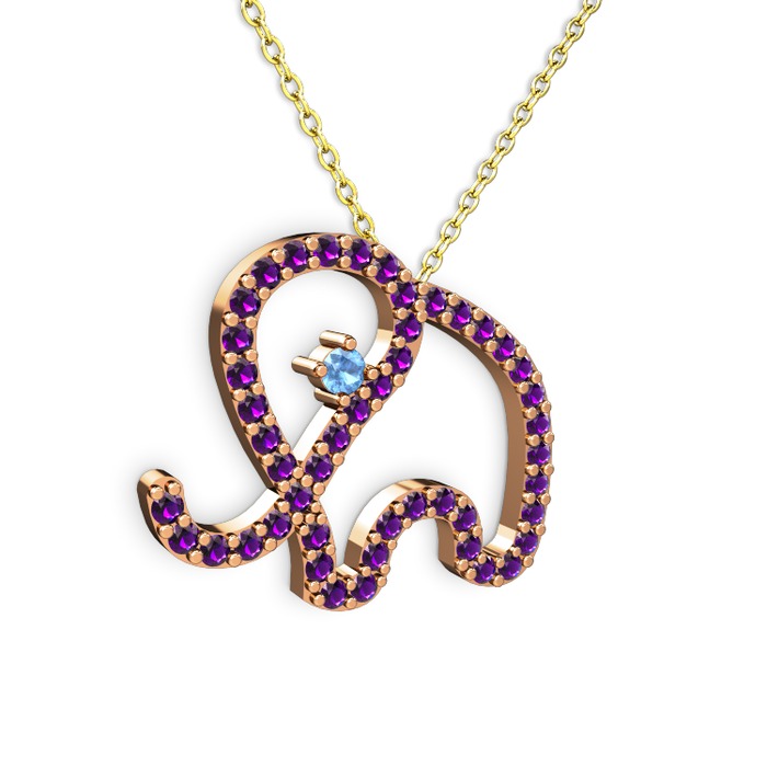 Ametist ve akuamarin 8 ayar rose altın kolye (40 cm gümüş rolo zincir)