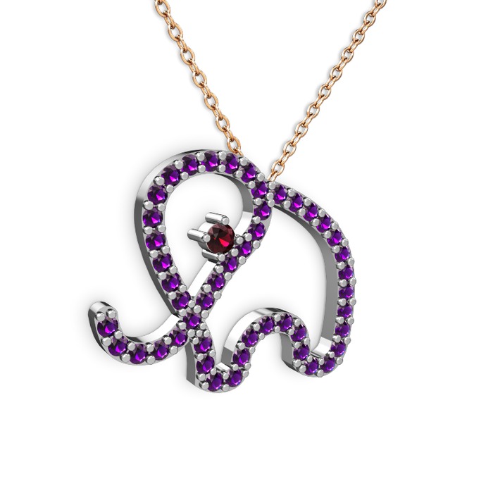 Ametist ve rodolit garnet 8 ayar beyaz altın kolye (40 cm rose altın rolo zincir)
