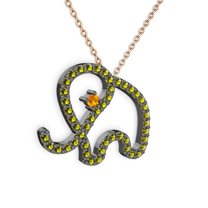 Peridot ve sitrin 925 ayar siyah rodyum kaplama gümüş kolye (40 cm rose altın rolo zincir)