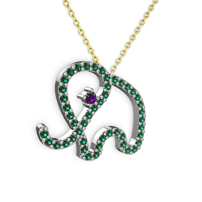 Yeşil kuvars ve ametist 18 ayar beyaz altın kolye (40 cm gümüş rolo zincir)