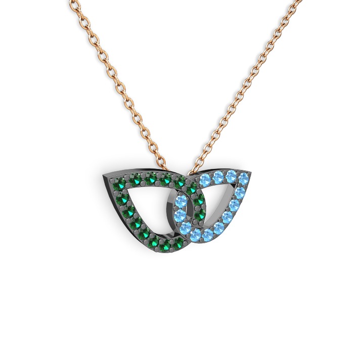 Akuamarin ve yeşil kuvars 925 ayar siyah rodyum kaplama gümüş kolye (40 cm rose altın rolo zincir)