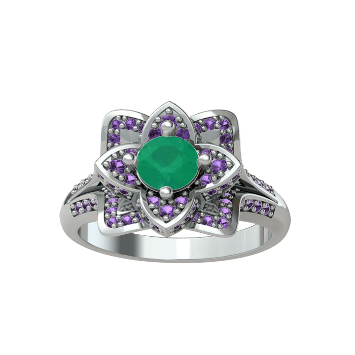 Kök zümrüt ve ametist 14 ayar beyaz altın yüzük