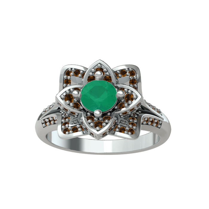 Kök zümrüt ve dumanlı kuvars 8 ayar beyaz altın yüzük