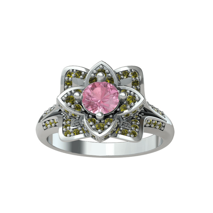 Pembe kuvars ve peridot 14 ayar beyaz altın yüzük