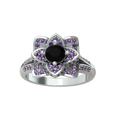 Siyah zirkon ve ametist 14 ayar beyaz altın yüzük