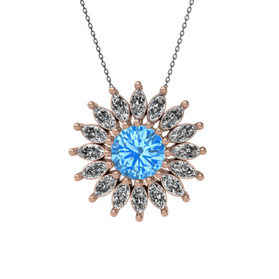 Akuamarin ve beyaz zirkon 14 ayar rose altın kolye (40 cm gümüş rolo zincir)