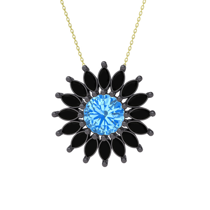 Akuamarin ve siyah zirkon 925 ayar siyah rodyum kaplama gümüş kolye (40 cm gümüş rolo zincir)
