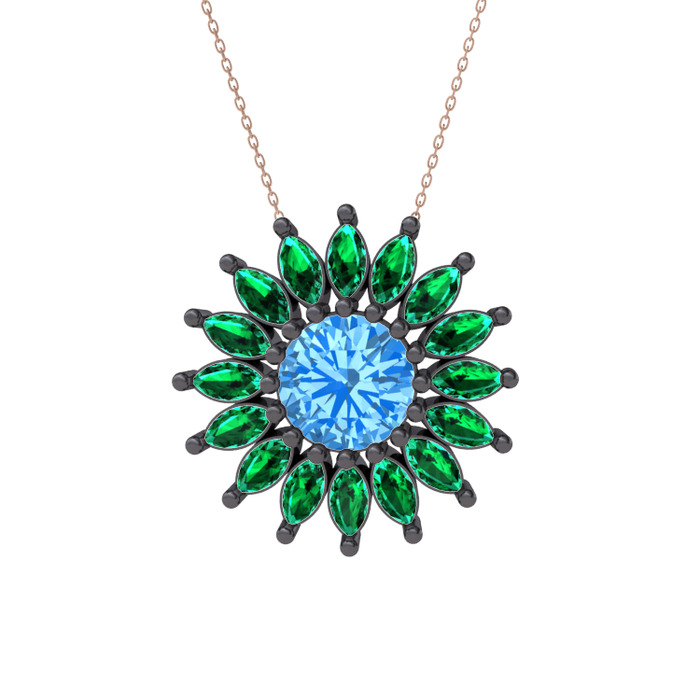 Akuamarin ve yeşil kuvars 925 ayar siyah rodyum kaplama gümüş kolye (40 cm rose altın rolo zincir)