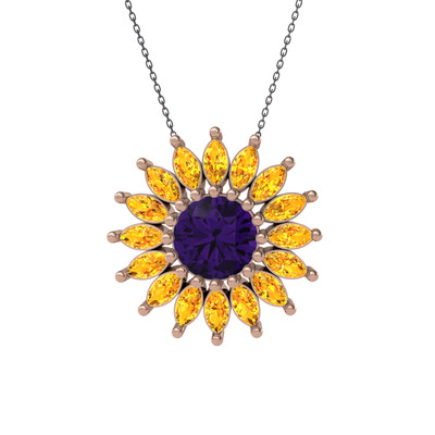 Ametist ve sitrin 14 ayar rose altın kolye (40 cm gümüş rolo zincir)