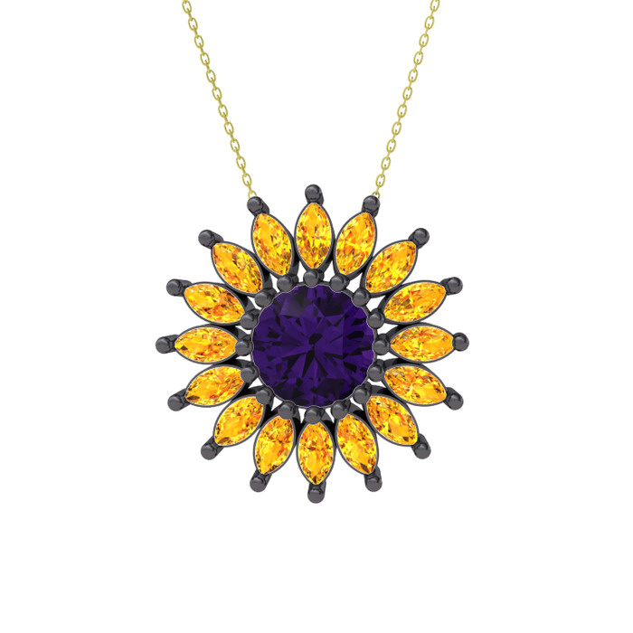 Ametist ve sitrin 925 ayar siyah rodyum kaplama gümüş kolye (40 cm gümüş rolo zincir)