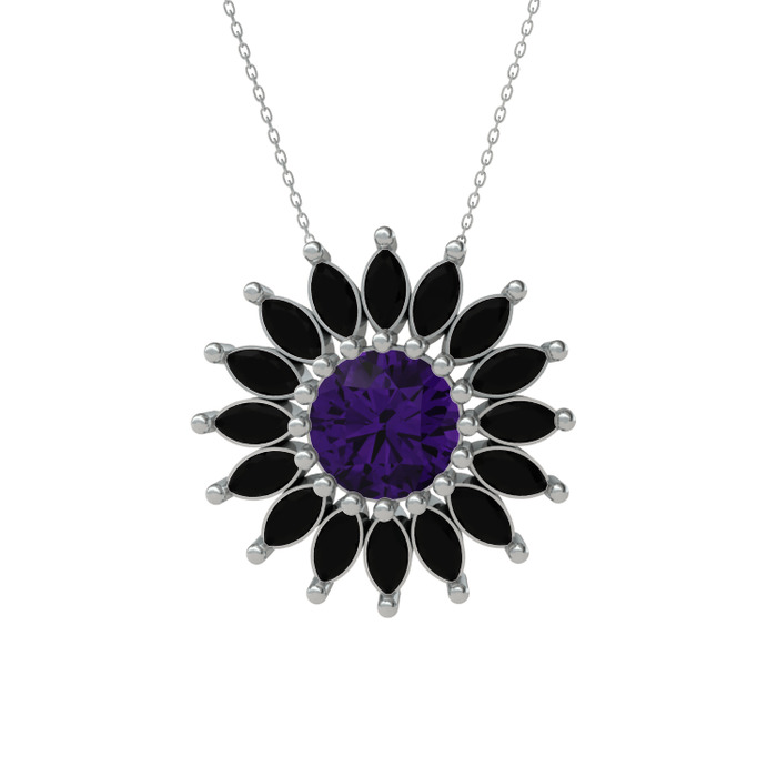 Ametist ve siyah zirkon 8 ayar beyaz altın kolye (40 cm gümüş rolo zincir)