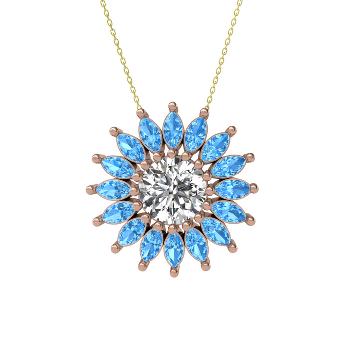 Beyaz zirkon ve akuamarin 8 ayar rose altın kolye (40 cm altın rolo zincir)
