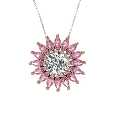 Beyaz zirkon ve pembe kuvars 18 ayar rose altın kolye (40 cm beyaz altın rolo zincir)