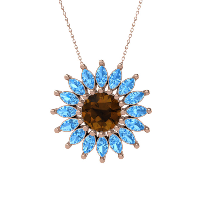 Dumanlı kuvars ve akuamarin 18 ayar rose altın kolye (40 cm rose altın rolo zincir)