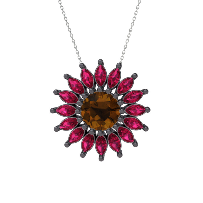 Dumanlı kuvars ve rodolit garnet 925 ayar siyah rodyum kaplama gümüş kolye (40 cm gümüş rolo zincir)