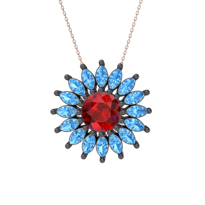 Garnet ve akuamarin 925 ayar siyah rodyum kaplama gümüş kolye (40 cm rose altın rolo zincir)
