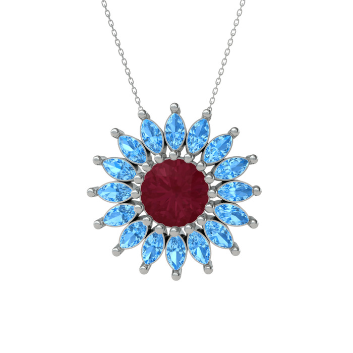 Kök yakut ve akuamarin 8 ayar beyaz altın kolye (40 cm beyaz altın rolo zincir)