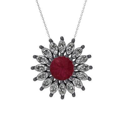 Kök yakut ve beyaz zirkon 925 ayar siyah rodyum kaplama gümüş kolye (40 cm gümüş rolo zincir)