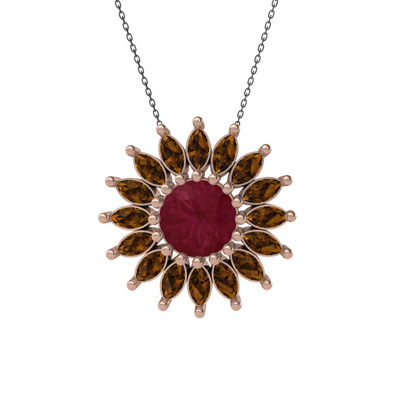 Kök yakut ve dumanlı kuvars 14 ayar rose altın kolye (40 cm gümüş rolo zincir)