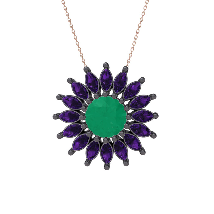 Kök zümrüt ve ametist 925 ayar siyah rodyum kaplama gümüş kolye (40 cm gümüş rolo zincir)