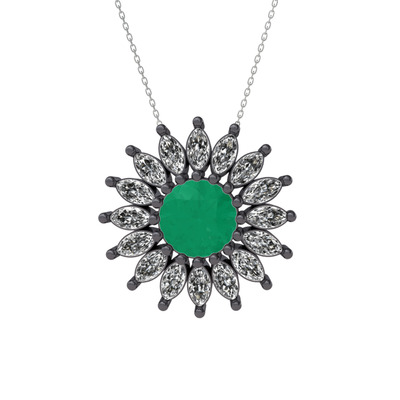 Kök zümrüt ve beyaz zirkon 925 ayar siyah rodyum kaplama gümüş kolye (40 cm gümüş rolo zincir)
