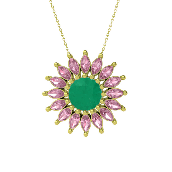 Kök zümrüt ve pembe kuvars 8 ayar altın kolye (40 cm altın rolo zincir)