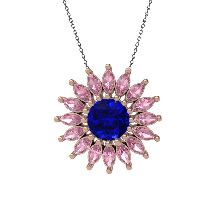 Lab safir ve pembe kuvars 8 ayar rose altın kolye (40 cm gümüş rolo zincir)