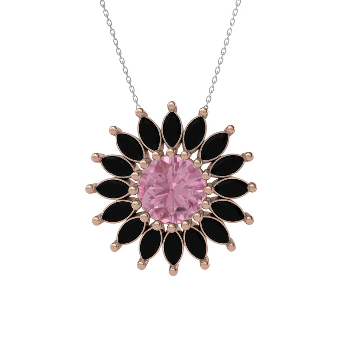 Pembe kuvars ve siyah zirkon 18 ayar rose altın kolye (40 cm beyaz altın rolo zincir)
