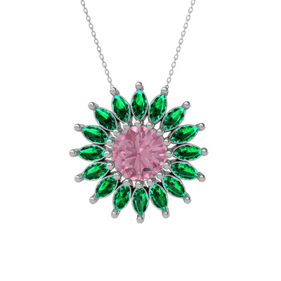 Pembe kuvars ve yeşil kuvars 18 ayar beyaz altın kolye (40 cm beyaz altın rolo zincir)