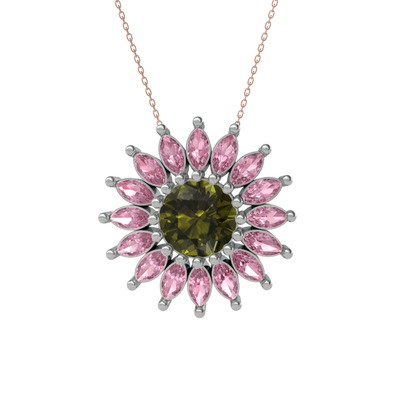Peridot ve pembe kuvars 14 ayar beyaz altın kolye (40 cm rose altın rolo zincir)