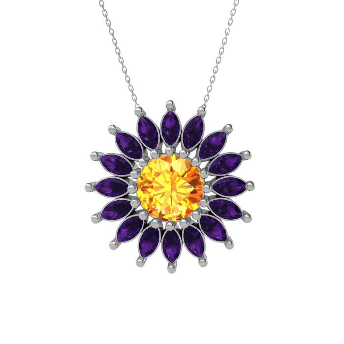 Sitrin ve ametist 14 ayar beyaz altın kolye (40 cm gümüş rolo zincir)