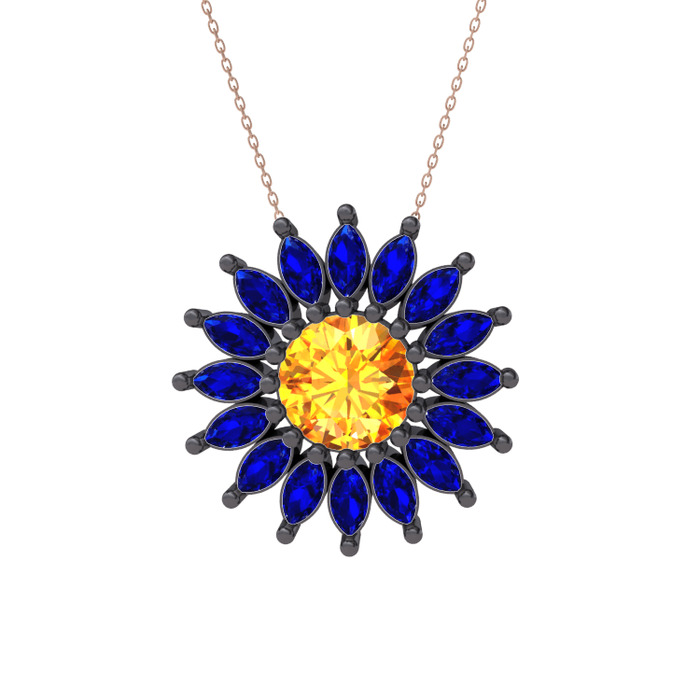 Sitrin ve lab safir 925 ayar siyah rodyum kaplama gümüş kolye (40 cm rose altın rolo zincir)