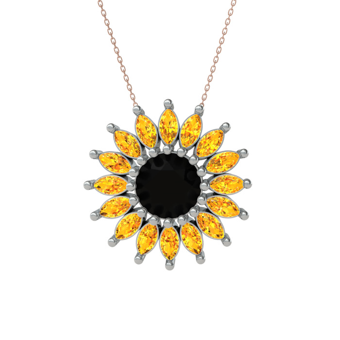 Siyah zirkon ve sitrin 18 ayar beyaz altın kolye (40 cm rose altın rolo zincir)